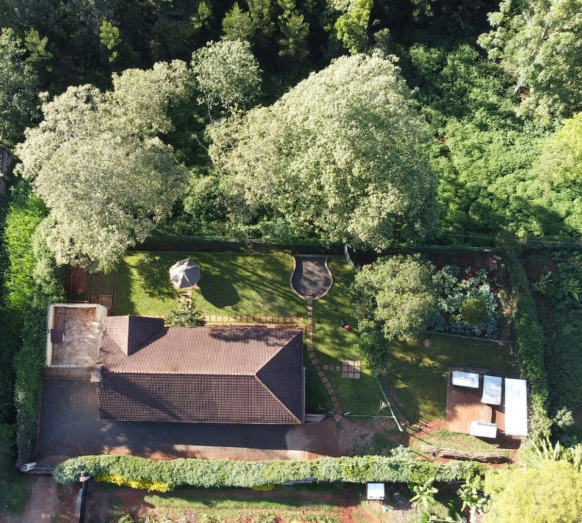 Koppla av med hela familjen eller vänner på detta fridfulla ställe. Huset med 4 sovrum ligger på 2 tunnland privat mark bredvid Mt Kenya Forest och rymmer 8 personer bekvämt. Boendet ligger 19 km från Naromoru stad, varav 7 km ligger på all väg. Det är en åktur värd destinationen! Njut av naturstigar i skogen, besök Mau Mau-grottorna, läs en bok medan du står inför skogen eller besök djuren på gården.