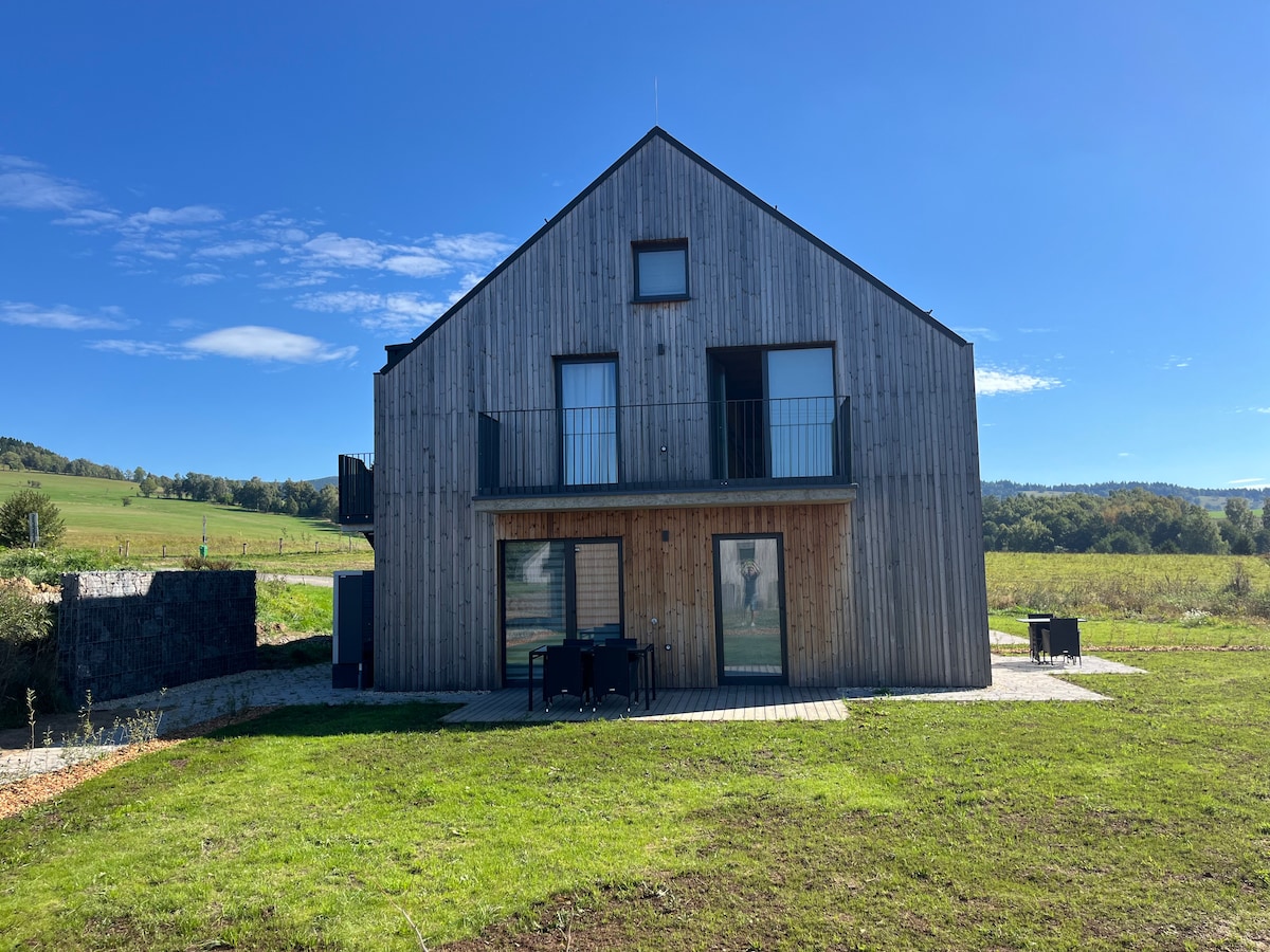 Den nybyggda Hayek Cottage i byn Česká Ves ligger bara 1 km från staden Jeseník, Priessnitz spa och under utsiktstornet Zlatý Chlum. Om du är ute efter komfort i en nybyggd stuga med en generöst utformad inredning är du här. Stugan är en bra service för gäster, både sommar som vinter. Den är anpassad för en bekväm vistelse på upp till 8 personer i storlek. Vi hyr ut hela stugan, så du kommer att ha din integritet. Din komfort är viktigt för oss.