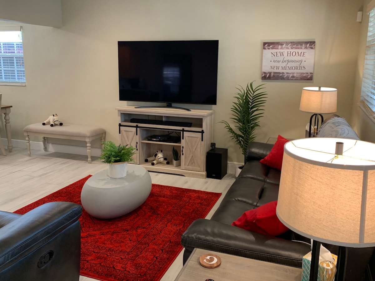 A completely renovated apartment that's been updated with a new kitchen, bathroom, central air conditioning. Very clean. 1 queen-sized bed and 1 sofa pulled out. Two 4k SmartTV w/ Youtube TV, Amazon Prime, Netflix, HBO Max, ESPN+, Hulu, Disney+. Free in-unit washer and dryer. Free parking. About 10-15 minutes from Commercial Blvd Pier Beach and downtown Fort Lauderdale. Two gazebos, a 6-8 person hot tub, charcoal BBQ and golf putting green in a shared space. Ideal place to hang out with friends.