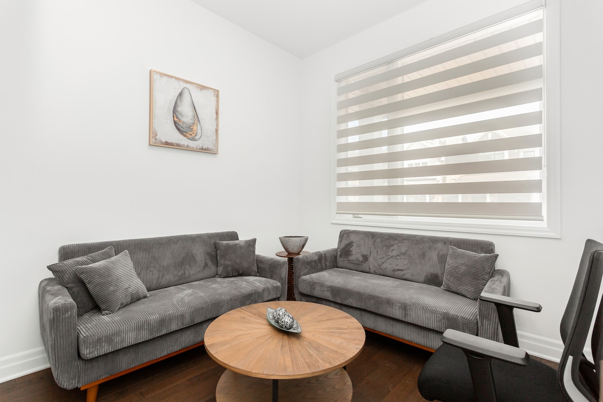 Vakna upp till fridfull utsikt över ravin i detta ljusa, moderna hem bara 10 minuter från 3 stora motorvägar (403, QEW, 407), Lakeshore och GO tågstation med tåg till Toronto hela dagen. Njut av ett lugnt och säkert område nära livsmedelsbutiker, kaféer och restauranger. Bland funktionerna finns ett fullt utrustat kök med induktionsspis, 75-tums SmartTV, snabbt Wi-Fi och ett dedikerat hemmakontor med dubbla 4K-skärmar och en Herman Miller-stol. Gör vårt hem till det perfekta utrymmet för både arbete och avkoppling.