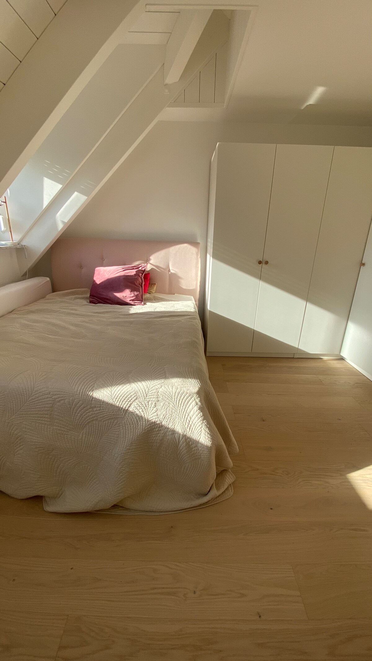 Det är en 80 m² vindsvåning på 2 våningar (1:a våningen: korridor, garderob, inbyggd garderob, duschrum/WC, 2:a våningen: loft med komplett kök, bar, matbord, soffa (eller bäddsoffa), skrivbord, öppen spis, dubbelsäng, badrum (WC/badkar/tvättmaskin) och hopfällbar säng vid behov. Monoblock Klimabox. Grannskap lugnt bostadsområde precis i utkanten av skogen. Parkering är alltid enkelt överallt. S-Bahn 7 minuters promenad eller 1 min buss. 15 minuters bilresa till Marienplatz.