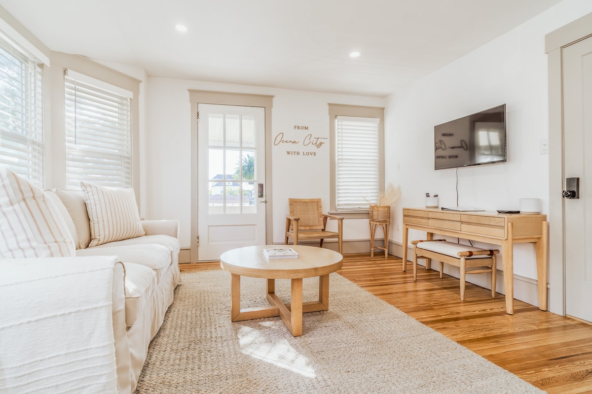 Välkommen till The Saltwater House! Detta boende är en del av Ocean Citys historiska distrikt, byggt 1920 och restaurerat 2020, och är fyllt med gammal charm, med nya moderna kustytor. Low Tide Suite ligger på bottenvåningen i boendet, vilket ger enkel åtkomst för gäster som reser med barn eller äldre gäster som föredrar att inte gå många trappsteg. Med en kort 10 minuters promenad till stranden och strandpromenaden är detta moderna minimalistiska utrymme ett bra ställe att känna sig som hemma för din strandsemester!