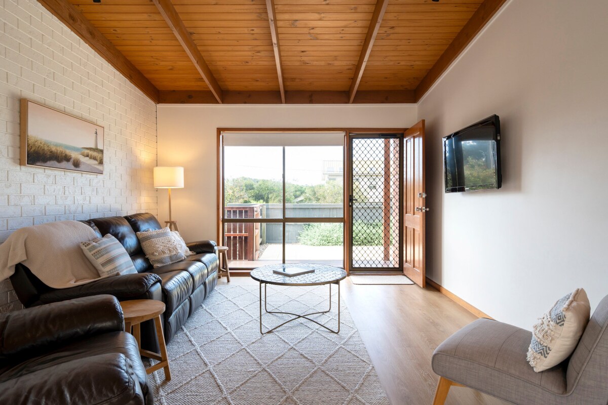Koppla av vid havet – Steg från Ocean Grove Beach Njut av en avslappnad kustresa i denna rymliga tvårumslägenhet, perfekt beläget bara 2 minuters promenad till stranden och en enkel 10 minuters promenad till Ocean Groves butiker, kaféer och restauranger. Perfekt för en liten familjegrupp eller två par/singlar, lägenheten rymmer bekvämt upp till fyra gäster, med en king size-säng och en queen size-säng, båda med bekväma madrasser och sängkläder av hög kvalitet för en god natts sömn.