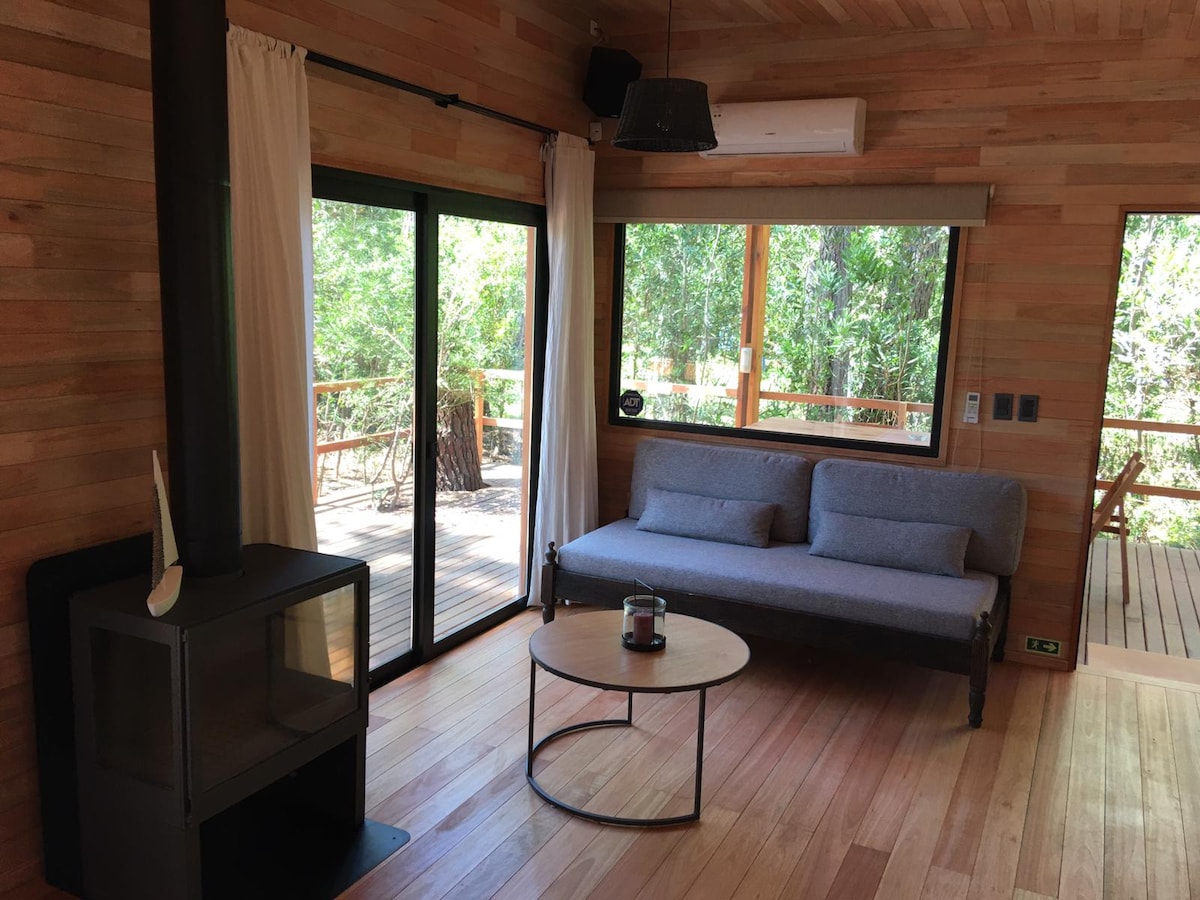 Mysig stuga i skogen i Punta Ballena. Perfekt för att komma iväg och vila i en naturlig och mycket fridfull miljö. Steg från Arboretum Lussich, perfekt för vandringar, promenader och njut av en kaffe med en utsökt La Checa-kaka. Minuter från Solanas Beach, Tío Tom, Las Grutas, Chihuahua. Vi har solstolar och paraply med uv-skydd. På vintern väntar vi på dig med Fueguito Engido. Huset är fullt utrustat för att få dem att känna sig bekväma som hemma.