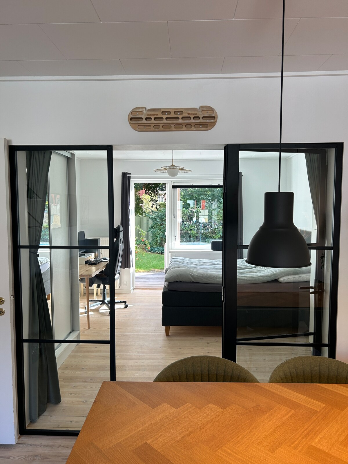 WATERFRONT APARTMENT, BEATYFULLY LOCATED – CLOSE TO ODENSE CENTER - Free parking and bikes available. Located above the ground floor and is done in a personalized scandinavian style with calm colors and a lot of light. Private entrance from a staircase/balcony, view to forest and water. The apartment is fully furnished. Two bedrooms, spacious bathroom and a integrated kitchen/ living room. We live in the ground floor and are reachable at any time. City center is a ten minutes bike ride away.