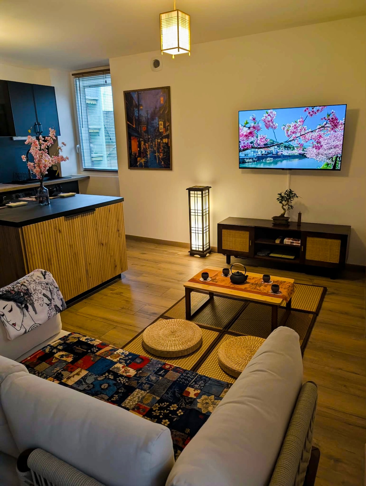 Meublé de tourisme 5 ⭐️ Venez vous ressourcer dans cette bulle de détente. Cet appartement décoré avec soin de 85m2 neuf situé dans une petite résidence au rez-de-chaussée est équipé d’un jacuzzi pouvant accueillir 3 personnes, d’un sauna et d’une terrasse privative. Profitez de votre séjour dans un endroit paisible et confortable. Petit déjeuner 25€ Décoration romantique/anniversaire 25€ Plateau raclette 40€ deux personnes Plateau repas charcuterie fromage 40€