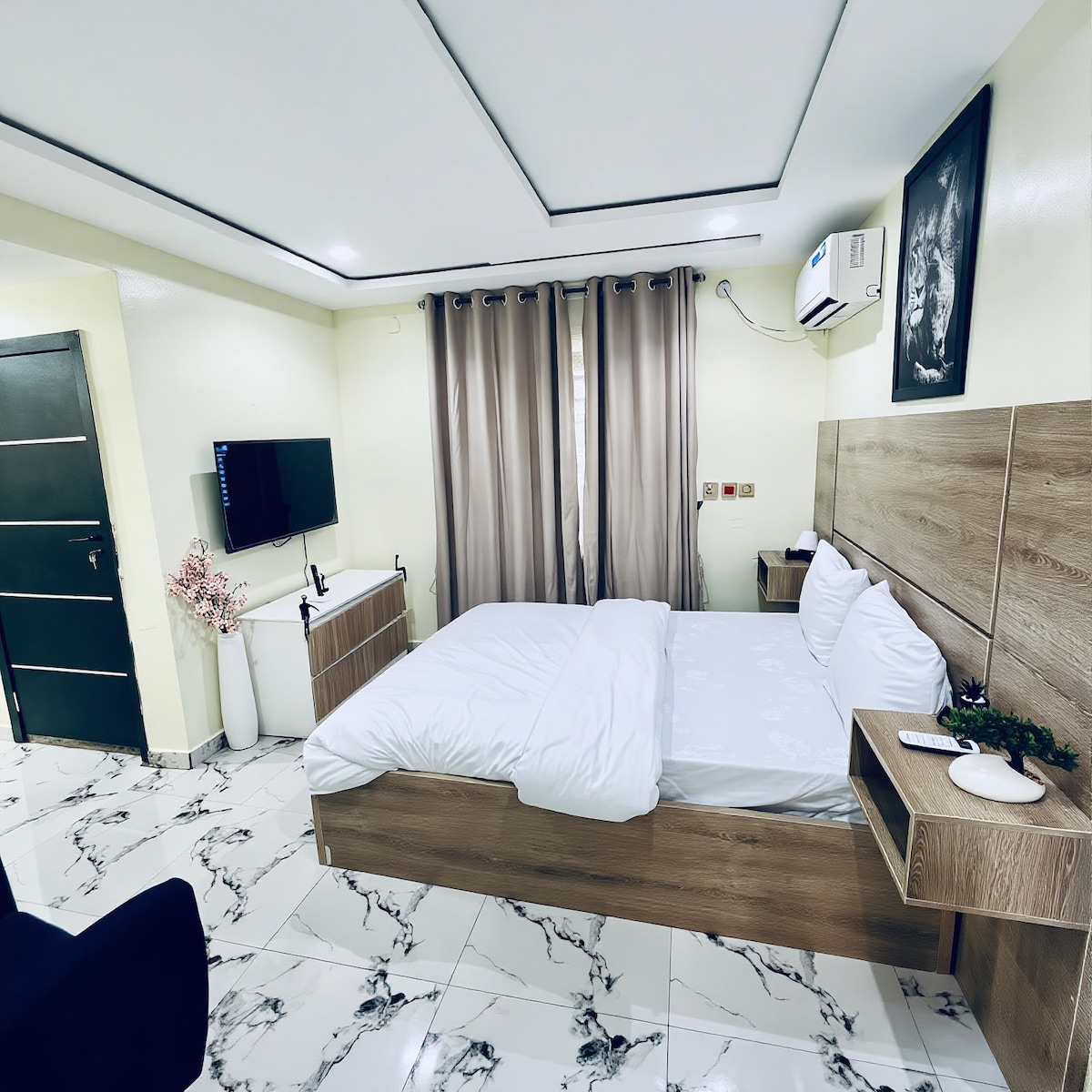 VÄNLIGEN LÄS Mycket ren och rymlig studio med 6 x 4,5 fötter säng, en soffa och ett pentry plus värme/ånga expeller. Ljust upplyst plus 24 timmars generator (snälla, generatoren driver inte AC, du kommer att använda fläkt när generatoren är på). TV med Netflix. Du har egen ingång. Mycket tillgängligt läge, du kan ringa Uber eller Bolt eller Taxify. 2 gäster Max. Tidig incheckning / sen utcheckning är $ 3 per avgift Rökning förbjuden i lägenheten. Bilparkering. Endast veckovis städning- Avanti Shortstay Apt.
