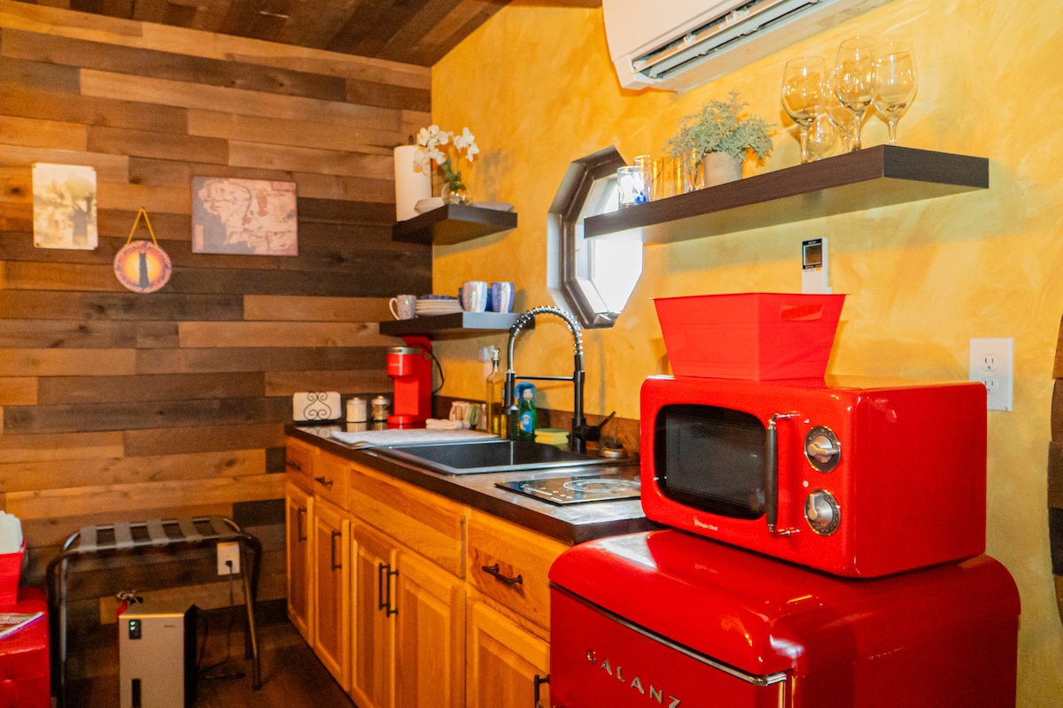 Föreställ dig... din egen hobbitinspirerade magiska sagoresa med panoramautsikt. Djurvänlig 3 miles från Hocking Hills State Park Ash Cave. Sitter på 11 tunnland. Bastukapsel på plats fråga om din kostnadsfria bastusession. Lyxig Queen-säng, unika ytor, ladugårdsdörr, elektrisk öppen spis och vintage fullt utrustat pentry. Kaffebryggare. Din egen bubbelpool. Utomhusgrill och öppen spis. All lyx och nyckfull charm. Charmig vingård i närheten. En kort bilresa till Cedar Falls, Old Man's Cave.