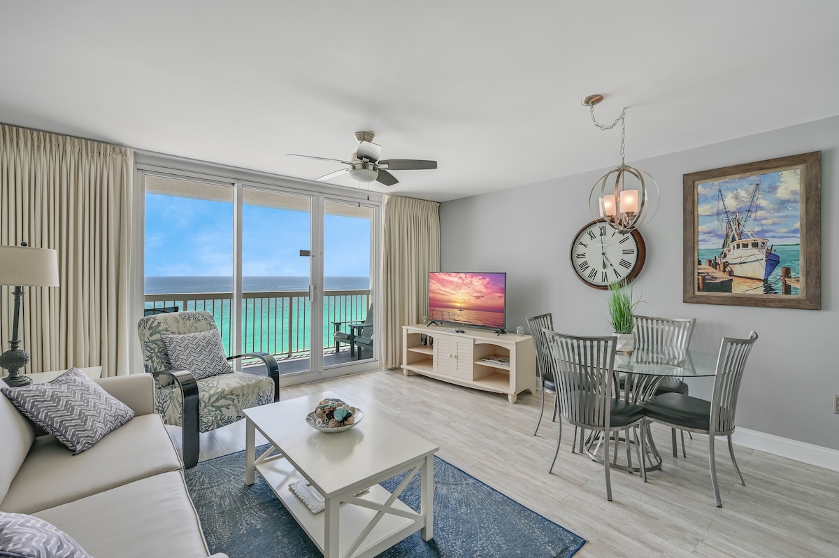 Nyrenoverad lägenhet med 1 sovrum/2 badrum med inbyggda våningssängar. Beläget på 19:e våningen med fantastisk panoramautsikt över smaragdvattnet och orörda vita sandstränder Mexikanska golfen. Fullt utrustat kök med nya granitbänkskivor och skifferapparater. Pålitligt snabbt höghastighetsinternet överallt. Bekvämligheterna på semesterorten inkluderar en stor pool och bubbelpool, en tiki-bar vid stranden som serverar frysta drycker och öl. Ett fantastiskt kafé som serverar varm frukost, pizza, smörgåsar och sallader.