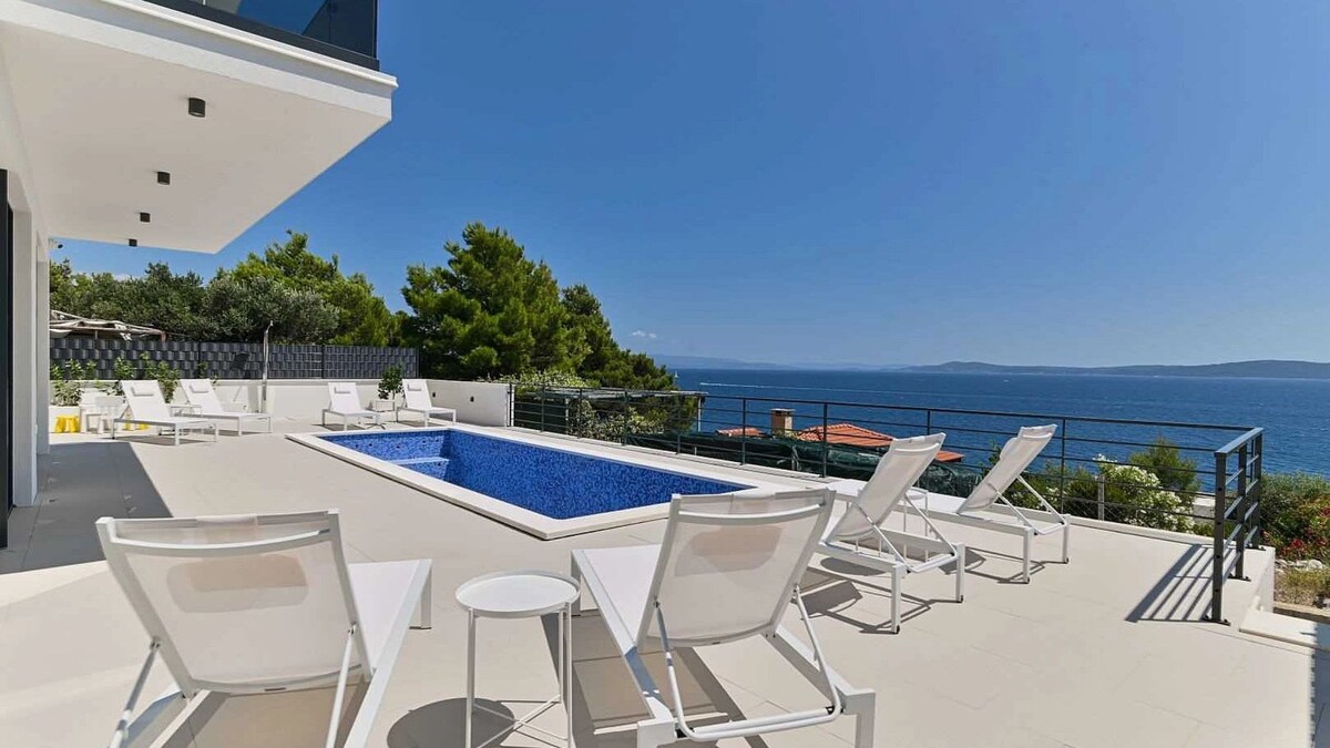 Moderne Villa auf Čiovo nahe Trogir mit zwei beheizten Pools, Panoramablick auf das Meer sowie Fitnessraum und Sauna. Ideal für Familien und Gruppen, mit 6 Schlafzimmern mit Bad en suite, großzügigen Wohnbereichen und fließendem Innen-Außen-Konzept. Ruhige Lage mit guter Anbindung an Strände, Trogir und Split.