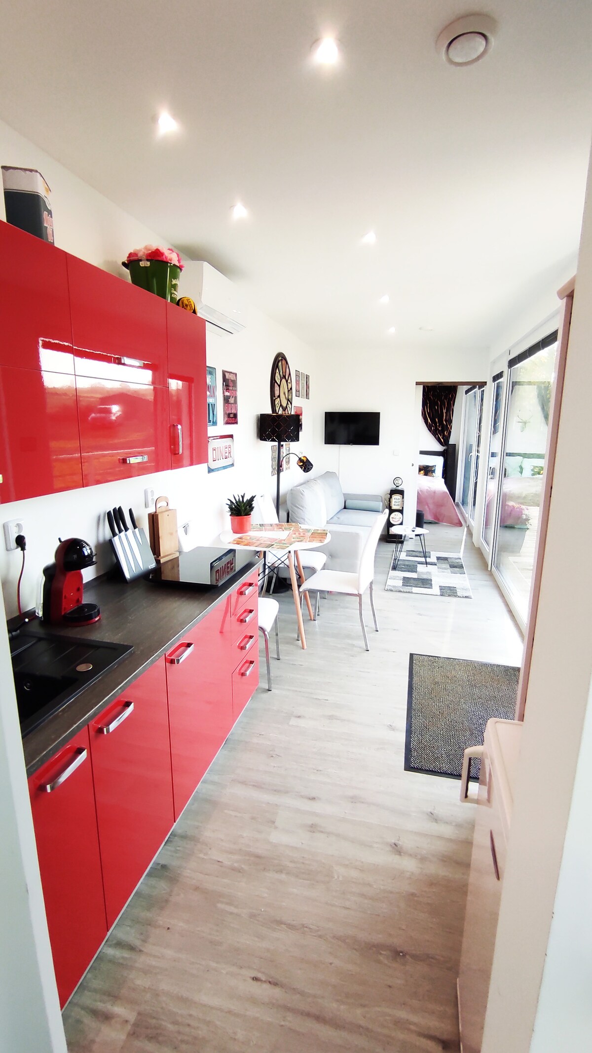 Ett separat hus med 2 rum och en total kapacitet på 4 bäddar. (rum på övervåningen - dubbelsäng + 2 enkelsängar, vardagsrum - bäddsoffa) Det finns ett fullt utrustat kök: kylskåp, glaskeramikhäll med tre plattor, mikrovågsugn, vattenkokare, brödrost, rengörings- och tvättmedel (vår, handdukar etc.). Badrummet har dusch och toalett. Vardagsrummet har en smart-TV, DVD-spelare och brädspel. Lägenheten har direkt tillgång till trädgården.