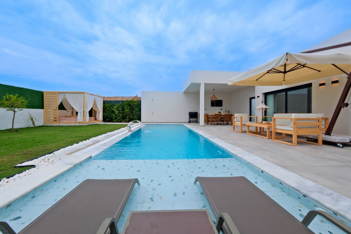 Minimalistisk bungalow med privat pool, jacuzzi