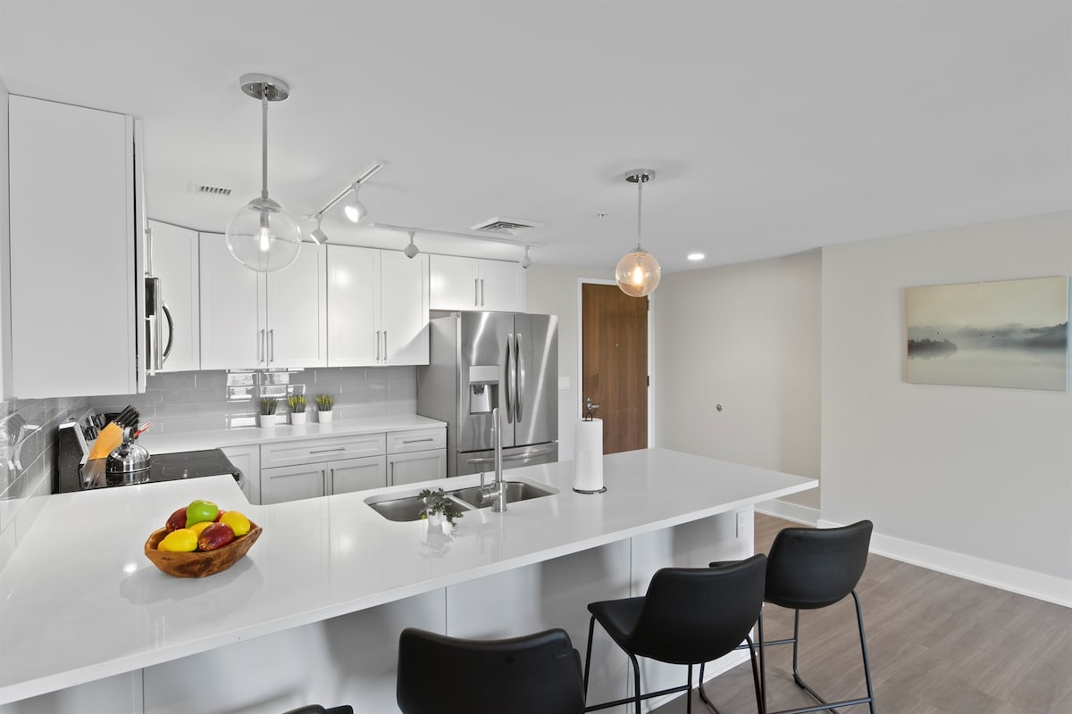 Njut av vacker panoramautsikt över sjön och omgivande kullar från den privata och rymliga balkongen. TILLSTÅND #2023-0075 Obefläckad och modern — 1 sovrum 1 badrum lägenhet, fullt utrustat kök, mysigt vardagsrum, 70-tums TV med Netflix och Internet TV/musikanaler, använd dina streamingtjänster etc. Läderfåtölj, fascinerande LED-öppen spis, mycket bekväm dubbelsäng, tvättmaskin, torktumlare, elegant spa-badrum och en möblerad balkong med elektrisk grill och en Finger Lakes-utsikt för att fånga ditt hjärta