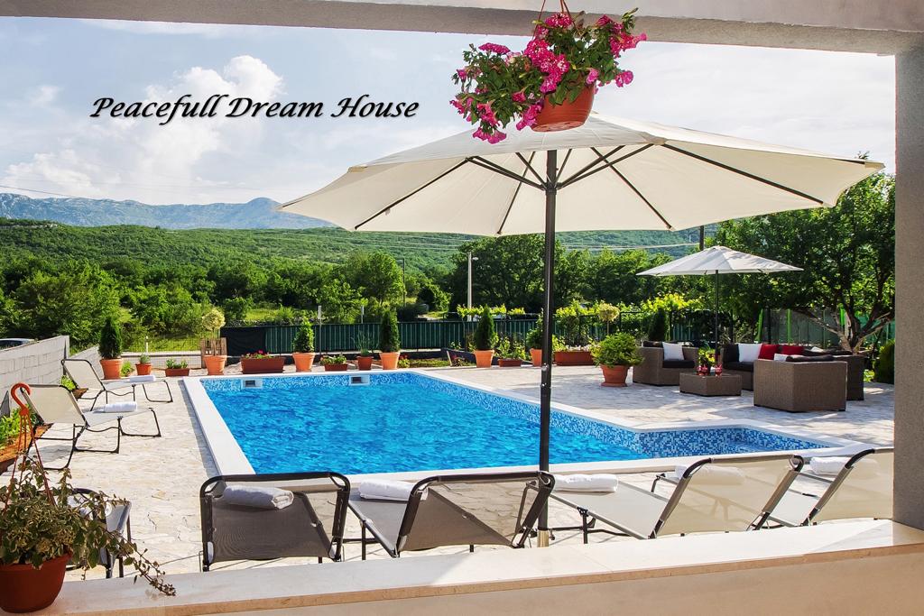 Modern inredd 290 m² två våningar villa med pool, stor gräsmatta och lekplats ligger i den vackra landsbygden i Dalmatiska Zagora. Med gratis WiFi, på bottenvåningen finns ett rymligt vardagsrum och matplats med en stor täckt terrass, kök, sovrum och badrum. Det finns också traditionell taverna med grill med separat ingång. På övervåningen finns fyra sovrum och två badrum, tvätt och strykning. I källaren finns en lekplats med biljard och dart.