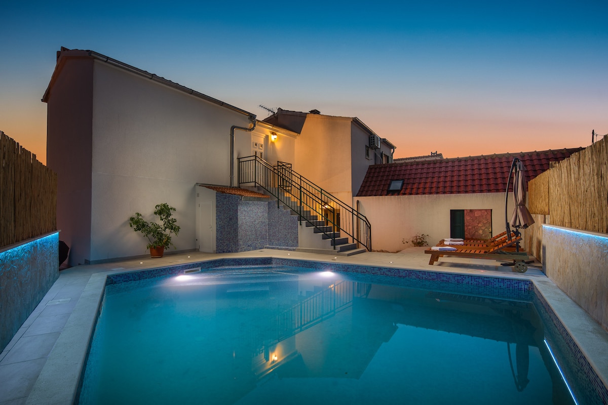 Två hus 4* med pool och litet gym, stor parkeringsplats, i inlandet av Primošten - ca 9 km bort. Varje hus tar emot 6 gäster, har eget kök och matsal, två sovrum, ett badrum . Längs poolen finns en stor terrass med grönska, paraply och grill, en del av terrassen är täckt. Gästerna har till sitt förfogande ett litet men funktionellt gym och bordsfotboll. Den första butiken är ca 500 meter bort, ett köpcentrum 4 km, Šibenik 20 km.