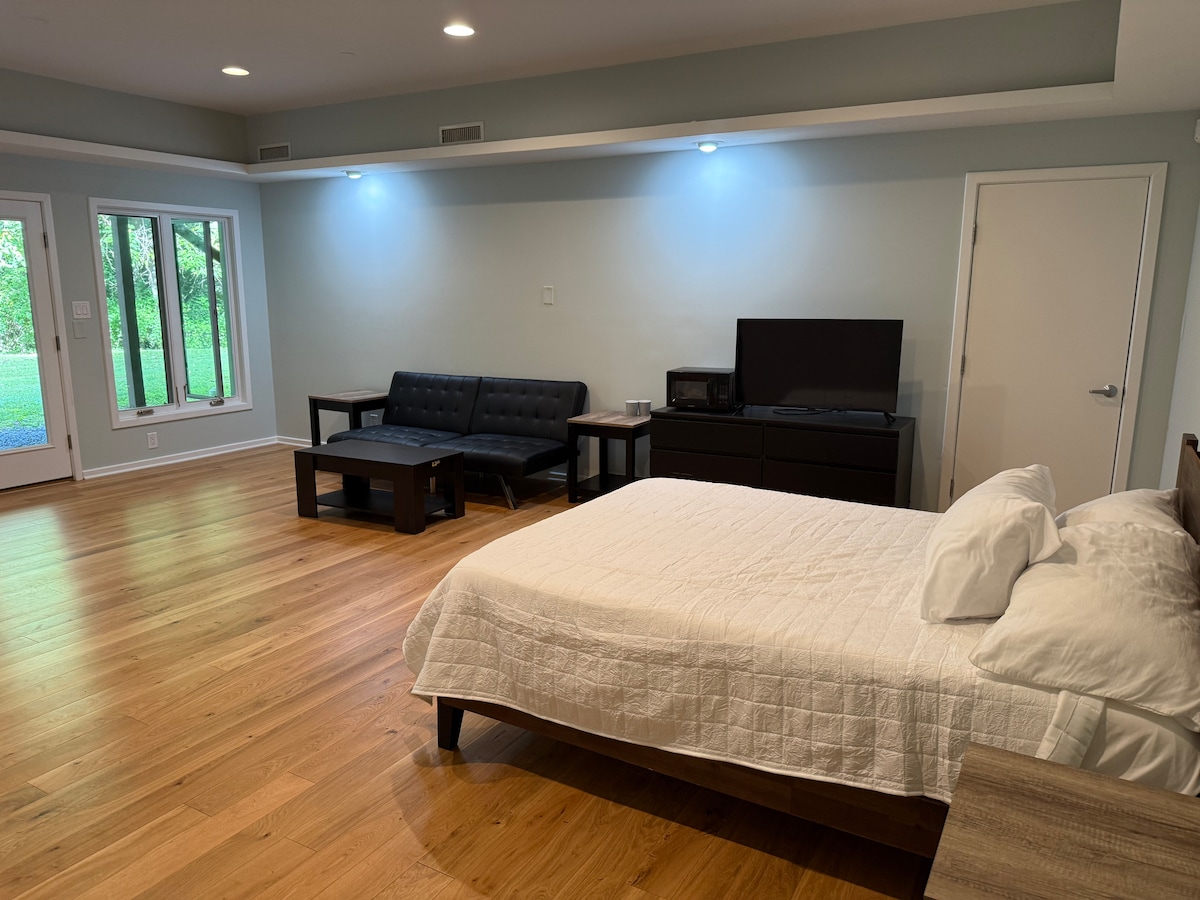 Cozy efficiency newly built in quiet neighborhood w/ private entrance. Two-room studio has forest view on two sides. Sliding glass doors open to fixed window screens to create totally open-air feel with cross breeze. Curtains wrap room for total privacy. King-size bed with memory foam mattress, work/dining area, kitchenette, 3/4 bath, and TV-viewing room. 2 miles from UNC, 5 miles from Duke. Jacuzzi available for up-charge (inquire FIRST before booking, recently out of order).