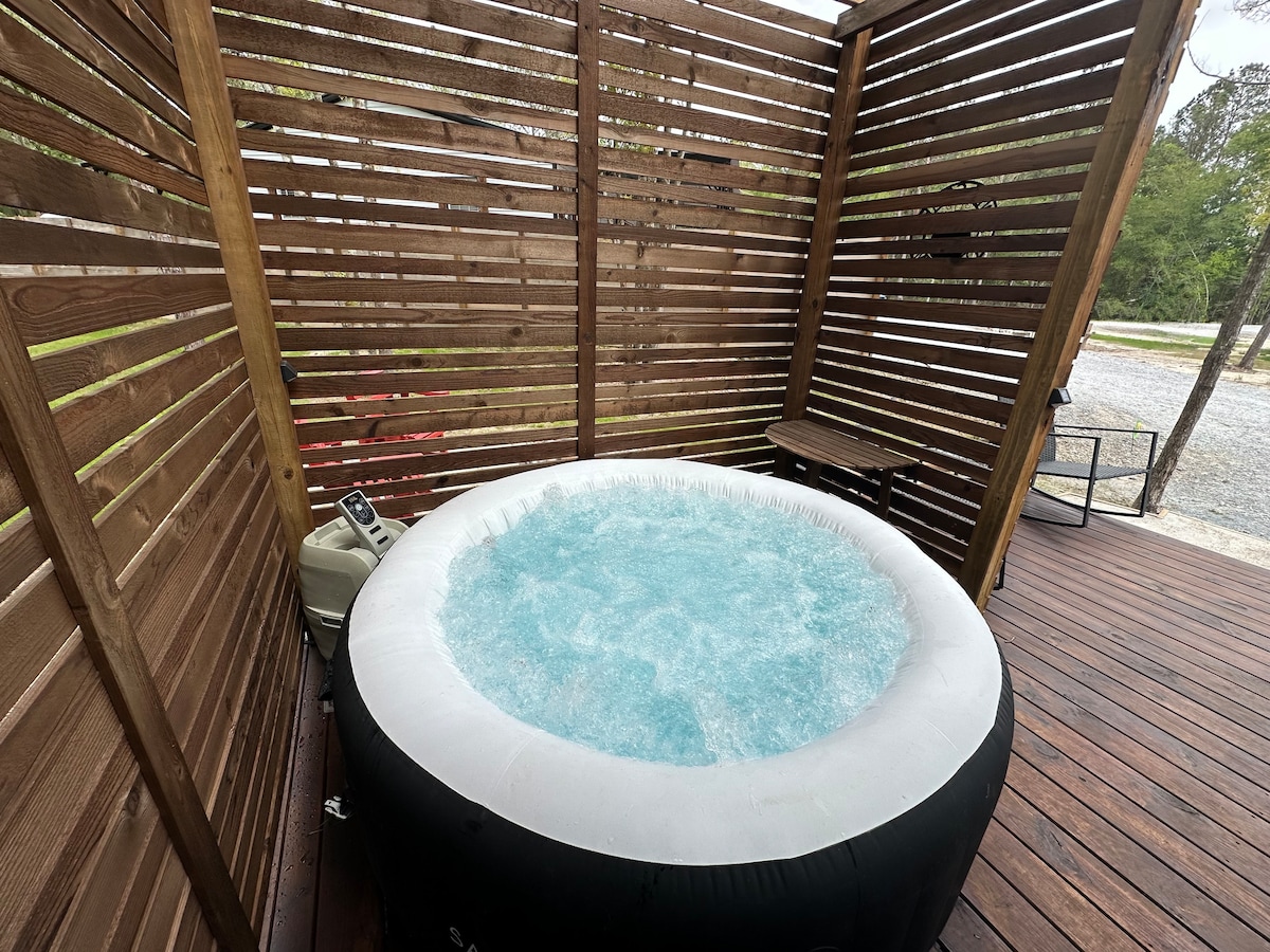 Welcome to “The Hunters Hut”, a private, cozy tiny space in the Pineywoods of Kountze, Texas, just 5 yards from the main house yet private. Relax on the porch with your favorite beverage, or unwind in your own private hot tub. Enjoy the shared dock at the pond, or try catch-and-release fishing (bring your own gear). Build your own private fire for the perfect outdoor evening—the adventure of camping with the comfort of glamping. Spacious for one, cuddly for two.