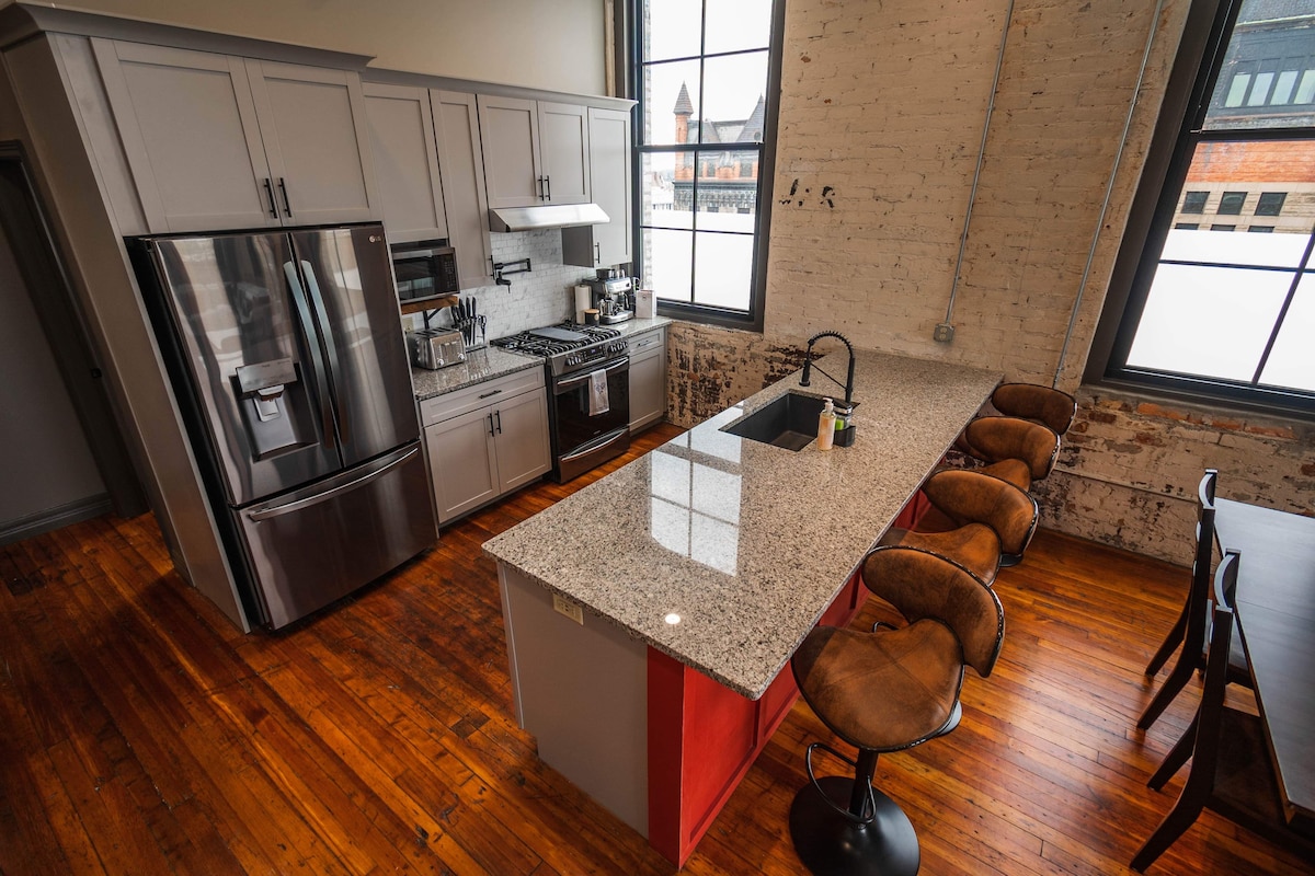 Boka din vistelse i hjärtat av Toledo centrum i de överdådiga och charmiga Wonder Bread Lofts. Dessa nybyggda loftlägenheter erbjuder en unik upplevelse med bekvämligheten av "kontaktlös" in- och utcheckning. Denna enhet är fullt möblerad med en ny minnesskum queen-size säng (6/5/22), smart-TV, soffa, arbetsstation, fullt utrustat kök, med tvättmaskin och torktumlare. Inkluderar fullt utrustat badrum med dusch och höghastighets wifi. Perfekt för affärsresenärer eller helgbesökare.