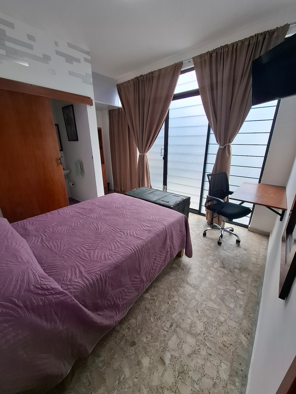 En el Centro de Orizaba, a tres minutos del Poliforum, para que sea muy fácil planear tu estancia. Disfruta del confort de la Suite con vista y salida al hermoso jardín, incluye aire acondicionado, una cama matrimonial con colchón premium, plancha de ropa, secadora de cabello, pantalla, área de trabajo, guardarropa, Wifi y baño privado. Además de áreas comunes: jardín, baño, alacena con llave para cada habitación, cocina equipada, sala, desayunador, comedor y Wifi en todas éstas áreas.