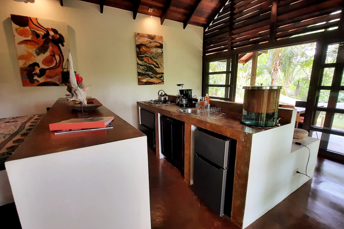 Njut av den avslappnade lyxen i 1 av våra 3 fristående bungalower i hjärtat av Uvita. Med en dubbelsäng, fiberoptik, luftkonditionering, dusch inomhus/utomhus och ett välutrustat kök. Njut av att upptäcka arapaer, kolibrier och trollsländor från din privata uteplats eller medan du tar ett dopp i din privata saltvattenspool med soldäck och solstolar. Vi är en 5 minuters promenad till den berömda Whale's Tail och är bekvämt beläget nära de bästa restaurangerna, surfing, yoga och äventyr som SoZo har att erbjuda.