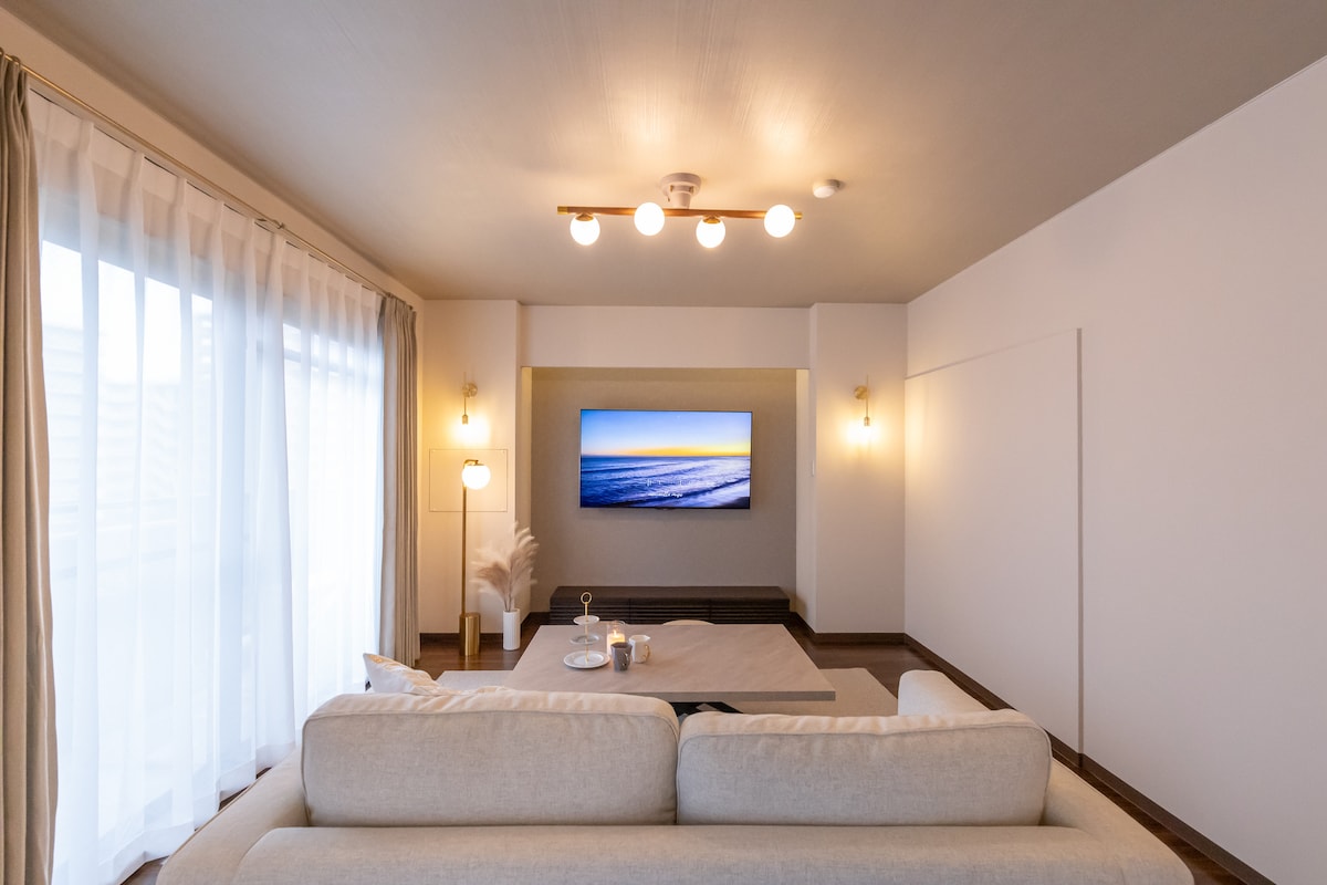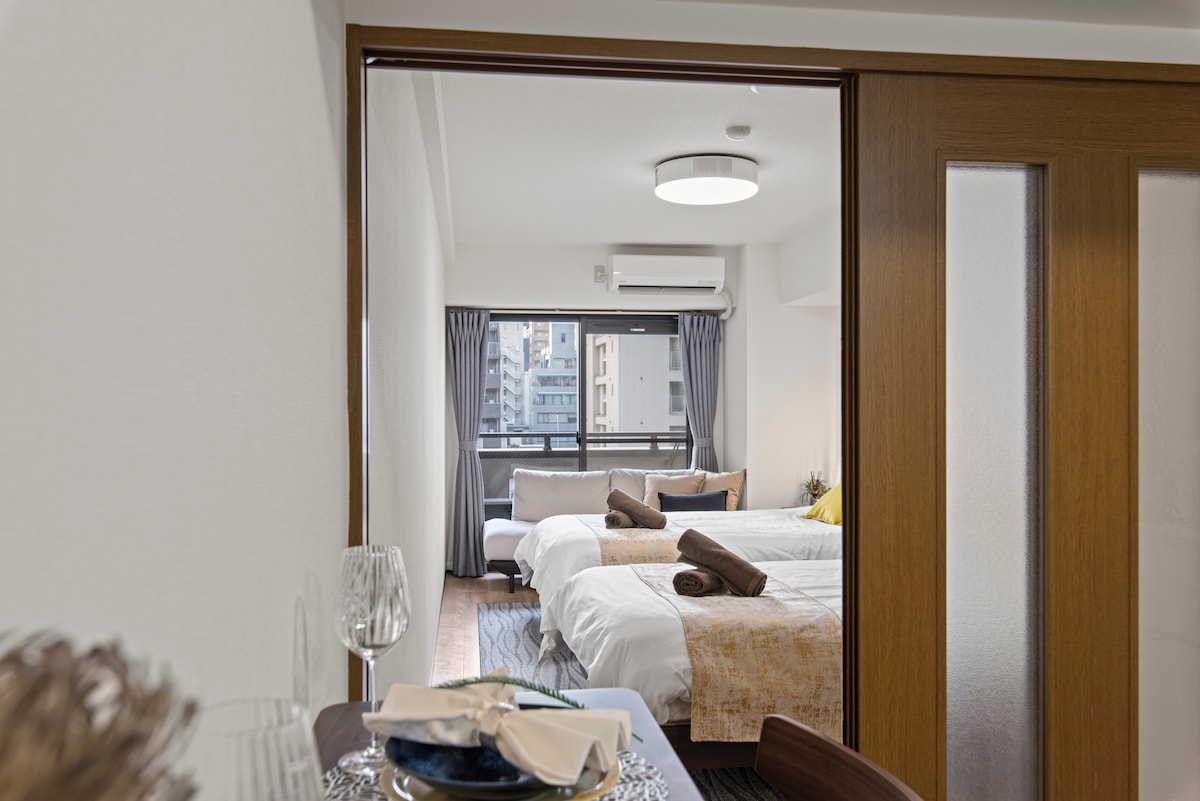 🚃Närmaste stationer ・Matsuyamachi station: 6 minuters promenad ・Tanimachi 6-chome station: 14 minuters promenad ・Shinsaibashi Station: 20 minuters promenad ・Kyoto: 50 minuter med tåg Boendet ligger 15–20 minuters promenad från Dotonbori, Osakas ikoniska landmärke, och Shinsaibashi, perfekt för shopping. Kansai International Airport är lättillgänglig. Inom 10 minuter hittar du bagerier, matställen och en stormarknad! Det erbjuder tillgång till USJ, Osaka slott, akvariet och dagsutflykter till Kyoto, Nara och Kobe.