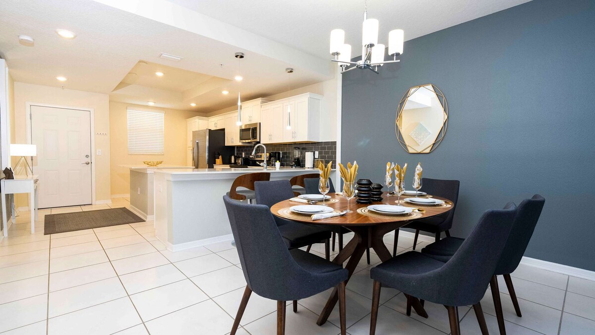 3 sovrum/2 badrum, 1300 kvadratfot 2:a våningen (hissar över korridoren). Rullstolsåtkomst till hiss på bottenvåningen. Boendet har vacker utsikt över dammen, poolen och majestätiska solnedgångar. Aktuellt golv genomgående. Dubbla granit handfat i badrum med badkar och dusch. Använder Active Pure UV luftreningssystem överallt. Nyckellöst låssystem. 7 miles från WDW. Steg från shopping, restauranger och lokala transiteringar. Perfekt familjeläge. Minuter från golf. Hörnenhet. Helt elektrisk.