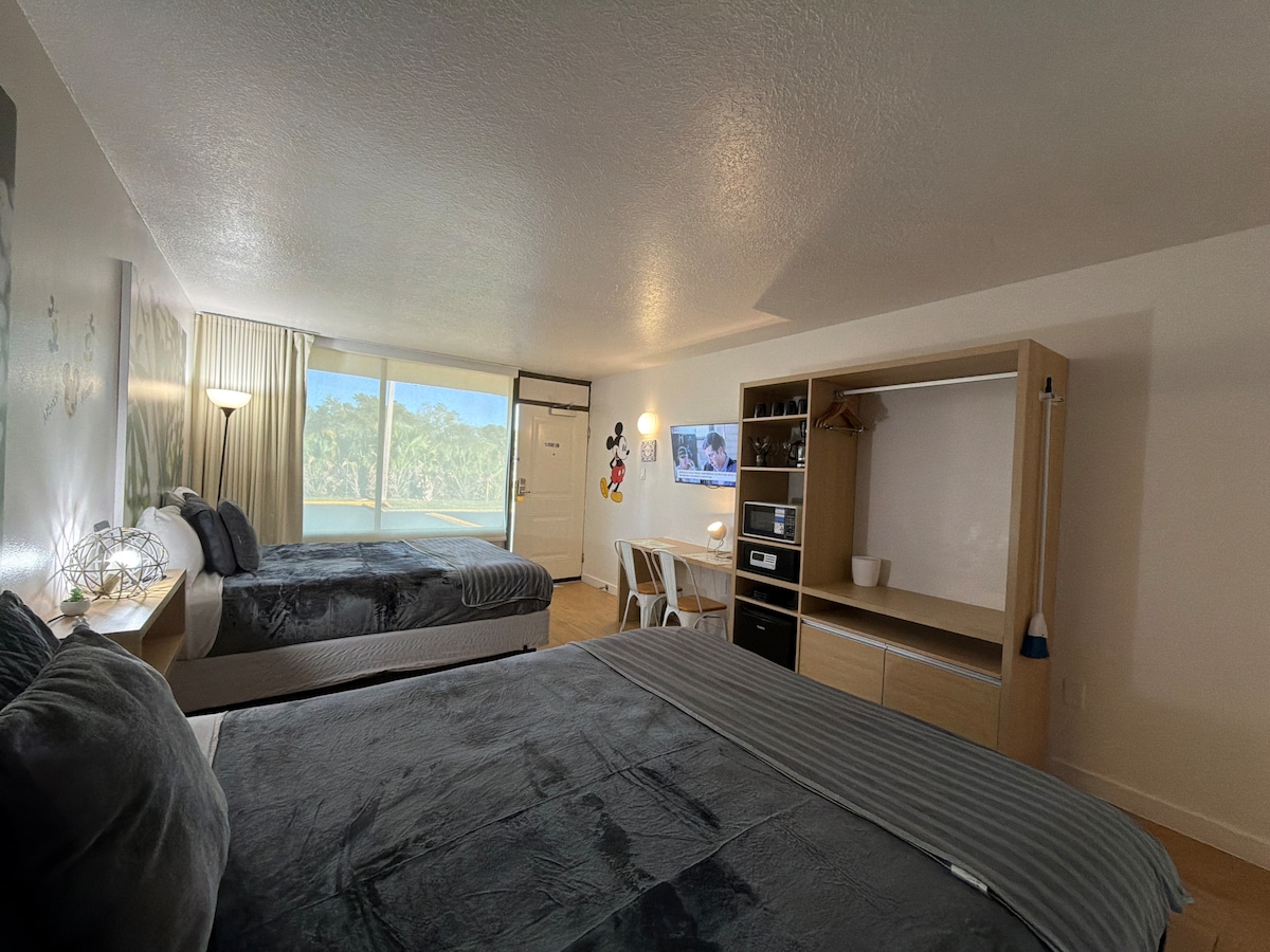 Un espacio sencillo y limpio de 28 metros cuadrados con cubertería completa para comidas ligeras (no hay fregadero exclusivo; se usa el lavamanos y se proporciona detergente y una esponja). Está muy bien ubicado y cuenta con piscina abierta desde el amanecer hasta el atardecer. Hay una zona de fumadores, un amplio jardín y amplio aparcamiento. Traslado gratuito a los parques da Disney en el ❤️ de Kissimmee.