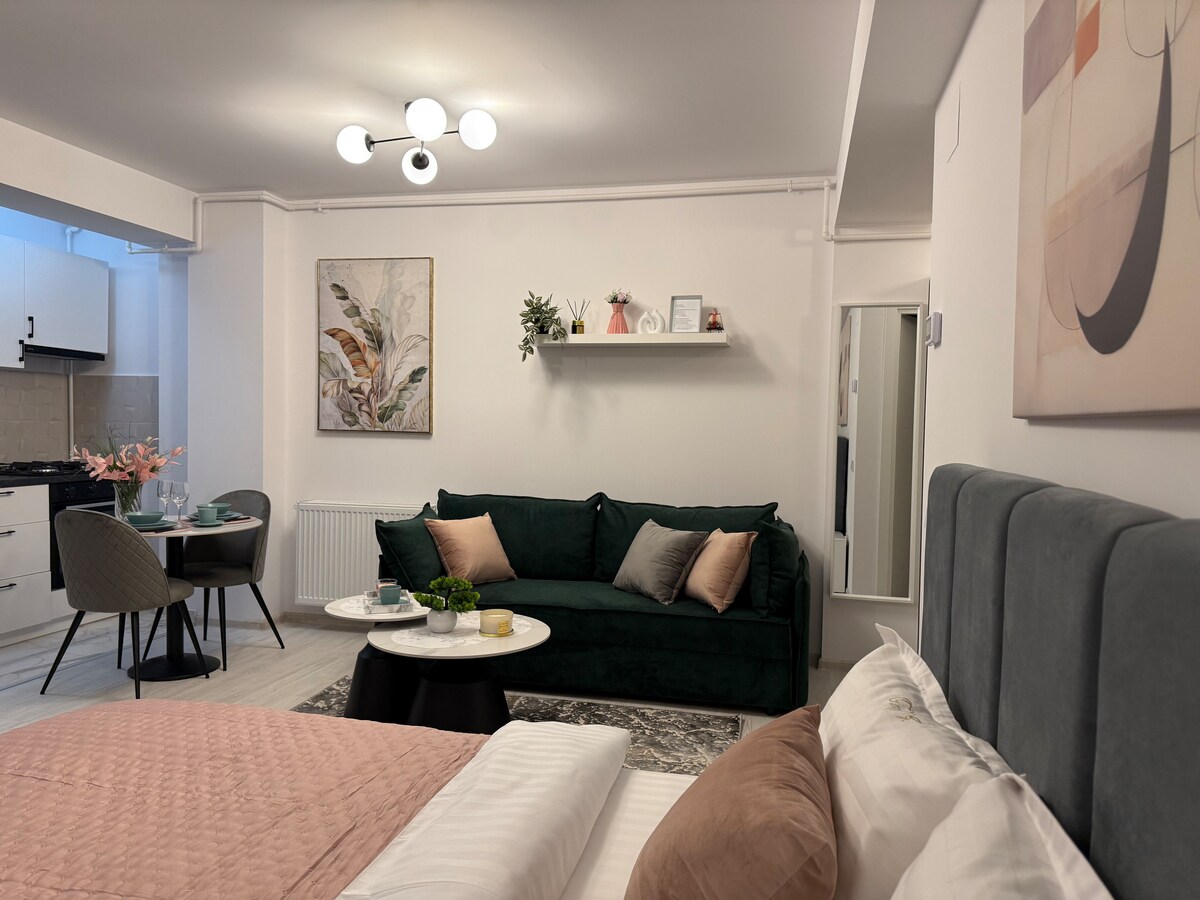 Hej! Jag heter Daniela och jag förser dig med en fullt möblerad, elegant studio. Resten och dagsområdet är avgränsade, vilket kan ses på bilderna. Det finns en dubbelsäng och en bäddsoffa. Studion är också utrustad med en platt-TV och fullt utrustat kök, som erbjuder gäster spis, mikrovågsugn, kylskåp och tvättmaskin i badrummet. Det är bara 1 km från Otopeni flygplats. Jag hoppas att du mår bra! 😀