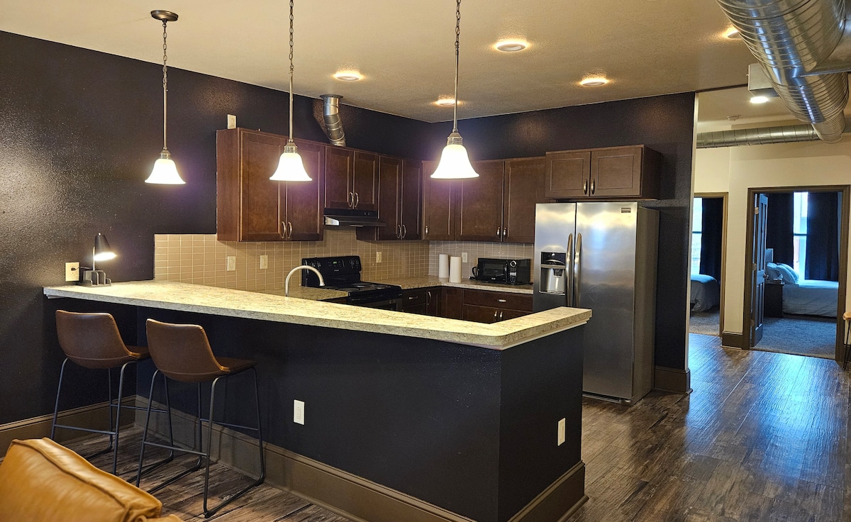 Denna rökfria lägenhet ligger på andra våningen i en historisk byggnad från mitten av 1880-talet, blandar denna rökfria, husdjursfria lägenhet charm och modern bekvämlighet, som uteslutande tillgodoser vuxna gäster. Med en modern layout, kvalitetsbekvämligheter och ett utmärkt läge inom gångavstånd från lokala barer och matställen, erbjuder det också enkel tillgång till vår mercantile och dolda speakeasy (21+). Perfekt för besökare och yrkesverksamma som söker en bekväm, tillfällig vistelse i Downtown Ottumwa.