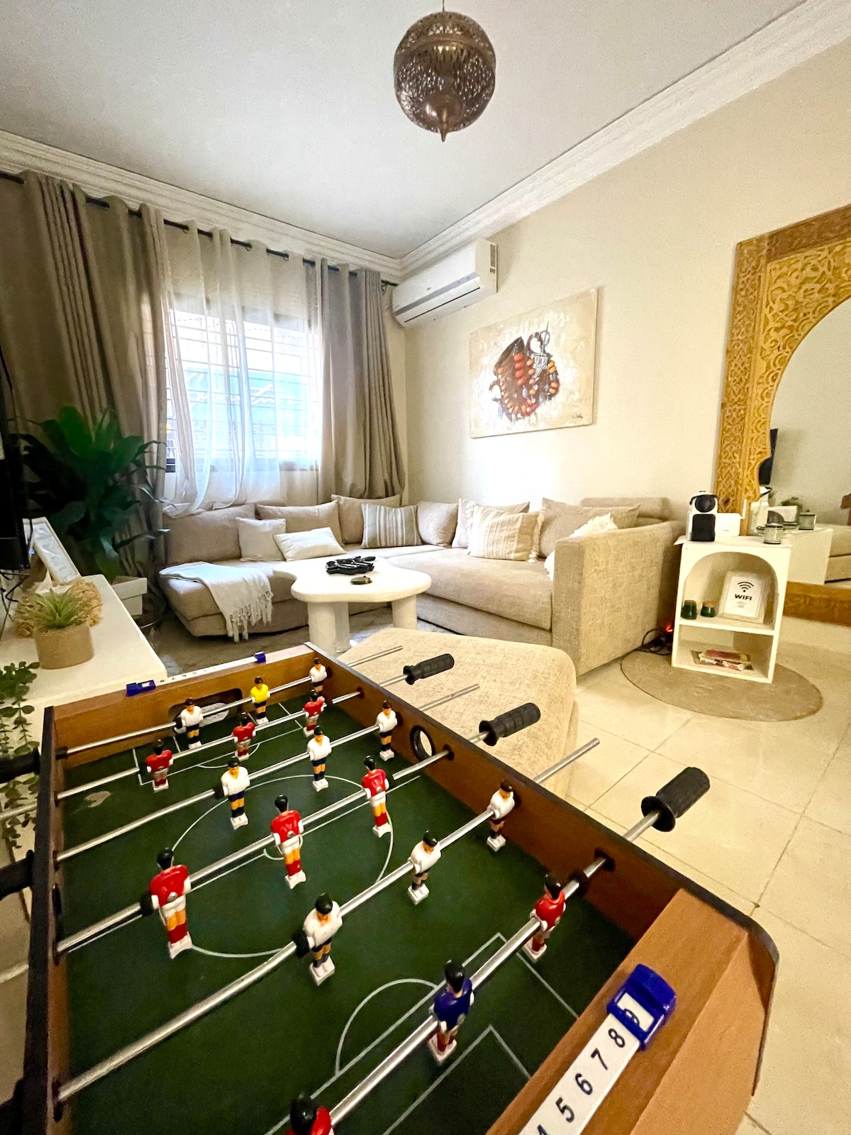 Välkommen till din urbana oas i Pearl Garden! Denna lägenhet ligger på ett exceptionellt ställe, 4 minuter från McDonald och 2 minuter från Marjane, bredvid Hotel WAZOO, och kombinerar elegans och komfort för en oöverträffad upplevelse. Vår lägenhet ligger i ett lugnt område och är en perfekt flykt från stadens liv och rörelse. Du kan njuta av solnedgången och poolen samtidigt som du är nära alla bekvämligheter och lokala attraktioner.