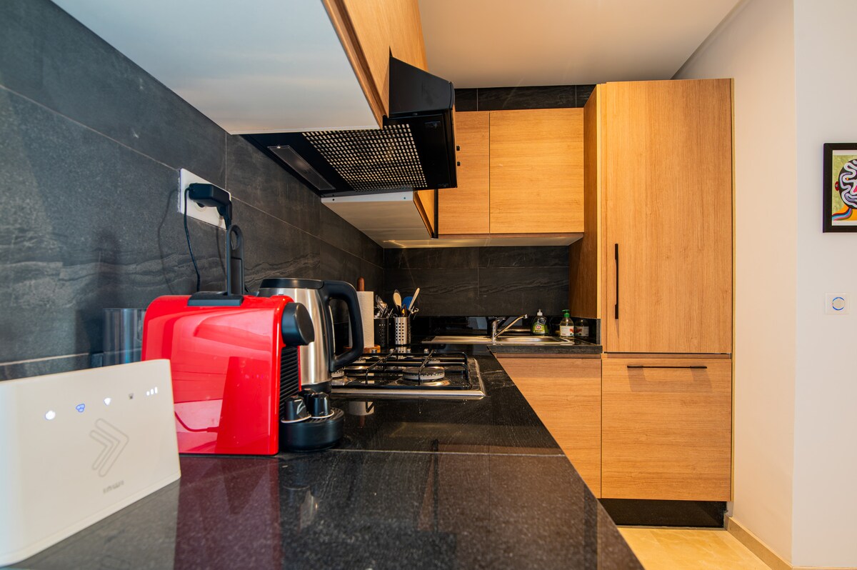 Unna dig en njutning genom att bo i denna ljusa och moderna lägenhet! Allt är bekvämt i denna lägenhet, konstverket och inredningen säger mycket om skönheten! Du och din familj eller dina vänner kan njuta av varandra utan att känna er trånga! om du andas frisk luft medan du njuter av en kopp kaffe/te under dagen medan du njuter av den fridfulla utsikten har denna lägenhet att erbjuda. det är ditt andra hemifrån när du utforskar Agadir.