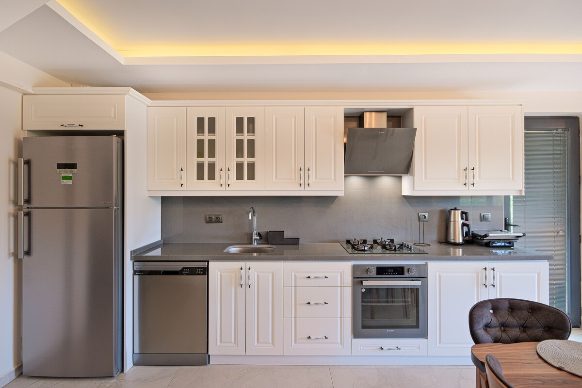 Vår villa ligger i Ölüdeniz, en av de mest populära semesterorterna i världen. Det ligger 10 minuter från havet och 5 minuter från livsmedelsbutikerna. Det har egen ingång, eget garage, egen pool och egen trädgård. Vår villa är insynsskyddad från utsidan och inhägnad. Det finns en grillplats vid poolen. Vår villa har parkering för ett fordon. Hela boendet är reserverat för dig. Organiserad så att du kan ha en ensam semester med din familj. Den har alla apparater, verktyg och enheter som ett boende bör ha. Luftkonditionering finns.