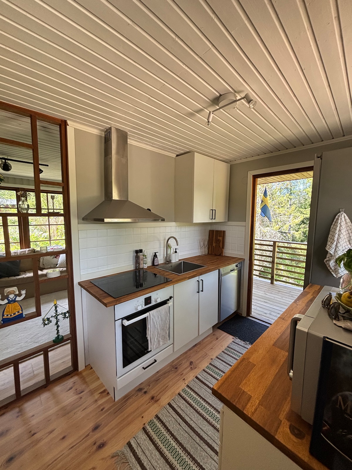 Charmig 130 år gammal stuga (90 m²) med en modern men mysig känsla. Två kända span (Yasuragi och Skepparholmen) ligger inom gångavstånd. Bottenvåning: kök och matplats med klassisk vedspis, vardagsrum och badrum. Din egen trädgård och rymliga trädäck – perfekt för solbad eller grillning. Beläget i ett vackert område med en kristallklar sjö för bad bara 200 meter bort, med ett naturreservat som omger den. Havsbrygga ~700 m. 30 minuter till Stockholm med Waxholmsbåt, buss eller bil.