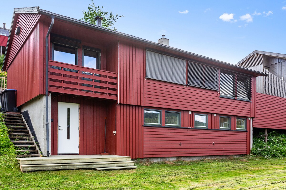 Huset ligger bara 15 minuters promenad från USN och FTO. 5 minuter med bil upp till Kongsberg Ski Center. Mycket fin utsikt över skidcentret. Blad: Målad panel på väggar och tak Golv: Telemark designlaminat, kakel på badrum, tvättstugor och entréer. Steg ljudplattor i alla våningar, inklusive källare. Kök: Norema kök med Miele-apparater. (kylskåp och frys är AEG) värme: Energibrunn med golvvärme i 100% av hemmet, mycket varmt och varmt hus. Konstant värme vid 24-25 grader.