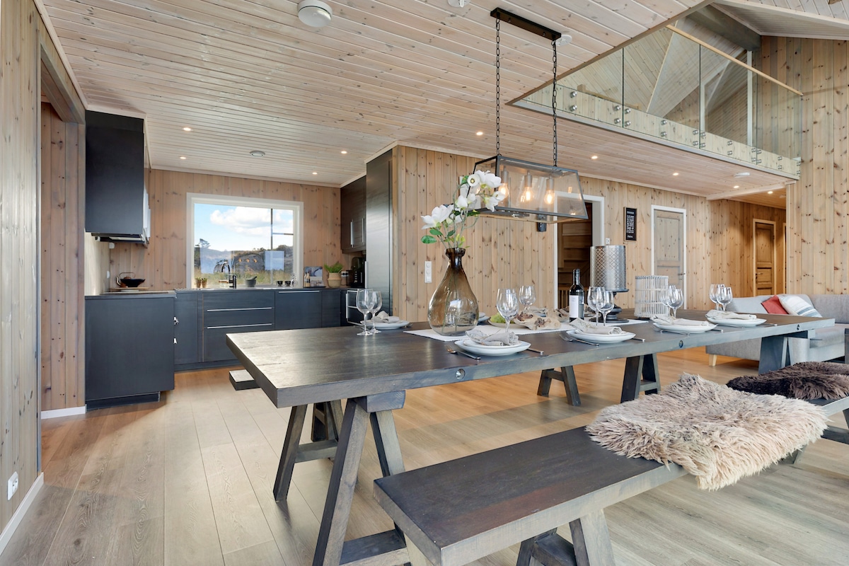 En stuga från 2017 med härlig havsutsikt som kan avnjutas från de stora fönstren eller från jacuzzin på terrassen. Interiören har tysta naturliga färger, nordisk stil. Öppen spis i vardagsrummet, öppen lösning från köket. 1: a våningen: 2 sovrum, 2 badrum, vardagsrum och kök, samt tvättstuga och hall. 2: a våningen: 2 sovrum och loft med bäddsoffa. Totalt 14 bäddar, plus resesängar. Eventuella extra madrasser för golvet. Stora vandringsmöjligheter i närheten, båtuthyrning samt en trevlig liten sandstrand nedanför Panorama hotell och semesterort i närheten.