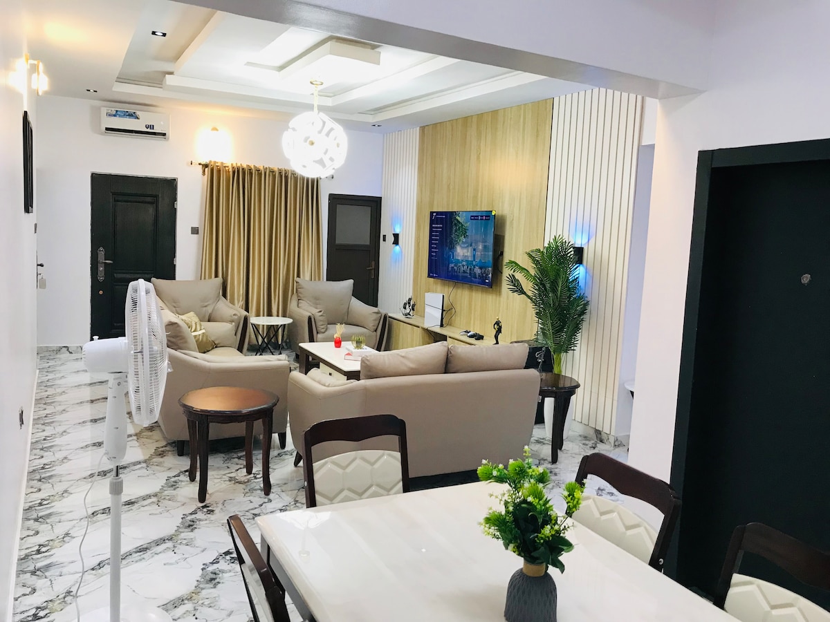 *Lugnt och centralt beläget ställe. * Gated and Secured Estate * Strömförsörjning dygnet runt (växelriktare stöds) * Lugn miljö * super snabbt internet * PS5-konsol , airhockey * Netflix / YouTube / Dstv / prime * Rum med eget badrum * Parkeringsplats * Utrustat kök * Tvättmaskin * Simbassäng * Balkongutrymme * Smakfullt möblerad Perfekt för företagsklient och familjesemester. PLS NOTE; * Ingen rök på balkongen * Ingen hög musik * Maximal beläggning (max 4-5)