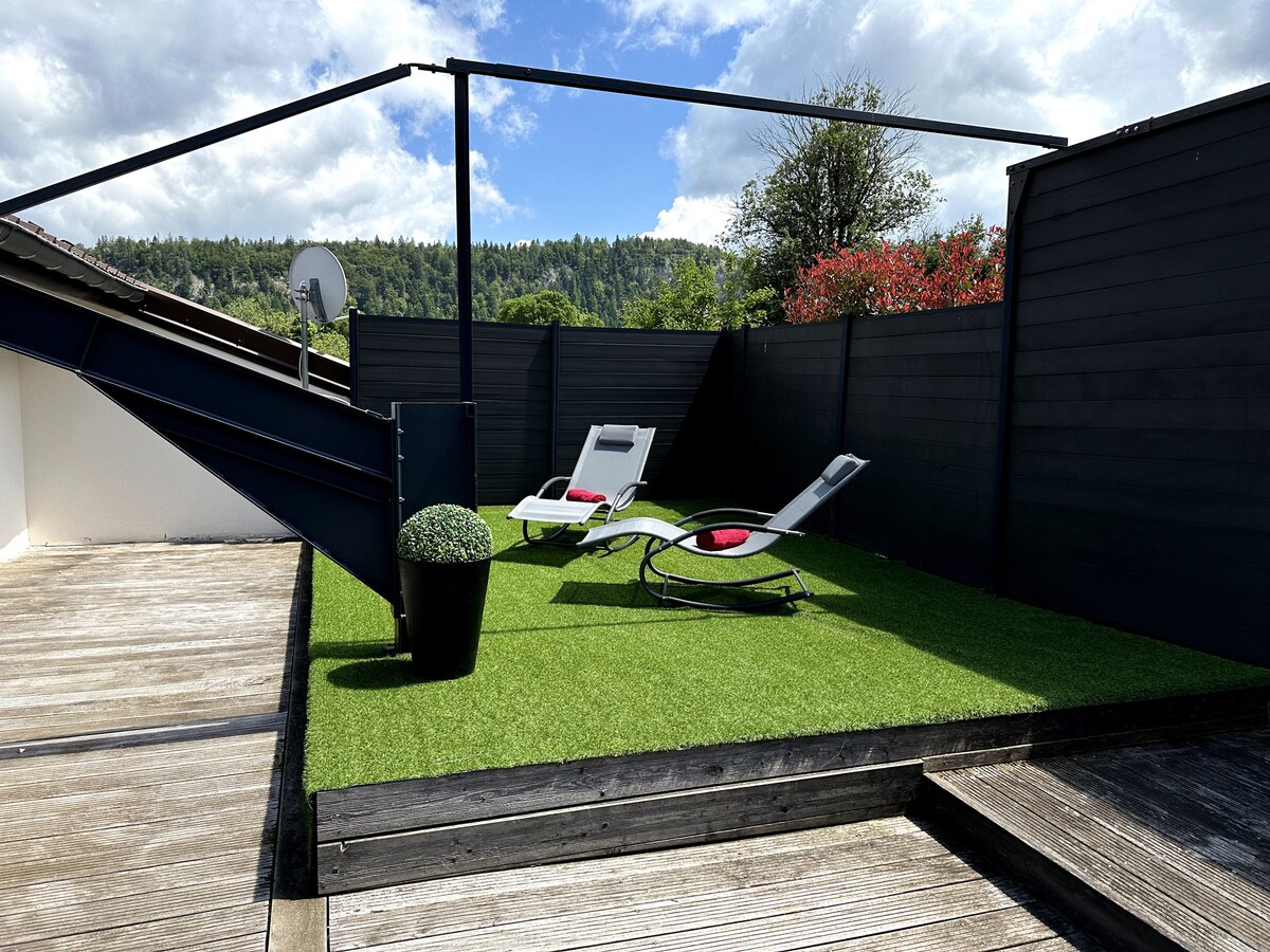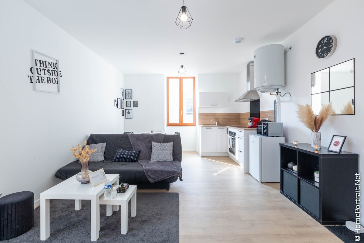 Välkommen till vår charmiga, moderna och renoverade lägenhet för 2 resenärer med tillgång till en trädgård🪴. Tillgänglighet anpassad för personer med nedsatt rörlighet. Beläget i centrum av Oyonnax 500 m från järnvägsstationen. Dess utmärkta läge gör att du snabbt och enkelt kan ta dig runt överallt för att upptäcka vår vackra stad och våra vackra landskap: Geninsjön, Bretouze, Jura, etc... Observera att incheckning sker från kl. 16.00 och utcheckning fram till kl. 12.00.