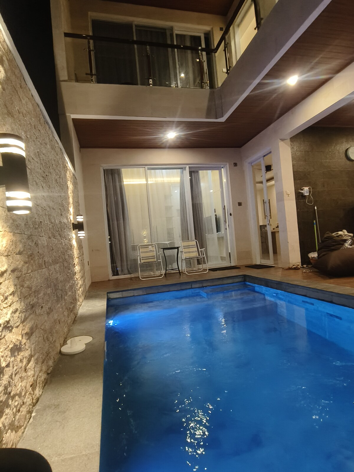 Detta är verkligen en unik. Många ställen på Bali har en blötläggningspool - som är stor nog för dina ben - VI har en djup pool! Du kan hoppa från andra våningen! Helt privat yoga-/surfgym, fantastisk torr bastu – ja, du kan stänka vatten och göra ånga! – med tillgängligt kallt dopp *lägg bara i is* "Jösses, vilken utsikt!" 360 graders tak med bar och bord sittgrupp. Borta från damm och folkmassor, bo på ett ställe som du kommer att skryta om för alla dina vänner och familj!!