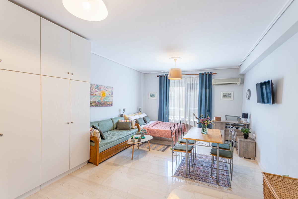 Detta är en ljus studio, som ligger på 1: a våningen i en lägenhetsbyggnad i centrum av Volos. Den har Wi-Fi, luftkonditionering, kylskåp, TV och pentry med alla köksredskap. Utrymmet är lämpligt för både enskilda gäster och par. Det är bara 3’promenad från kustvägen Volos, 2’ minuter från den centrala marknaden (Ermos) och har enkel parkering. Stället är perfekt för utflykter till de pittoreska byarna Pelion som Makrinitsa, Portaria.