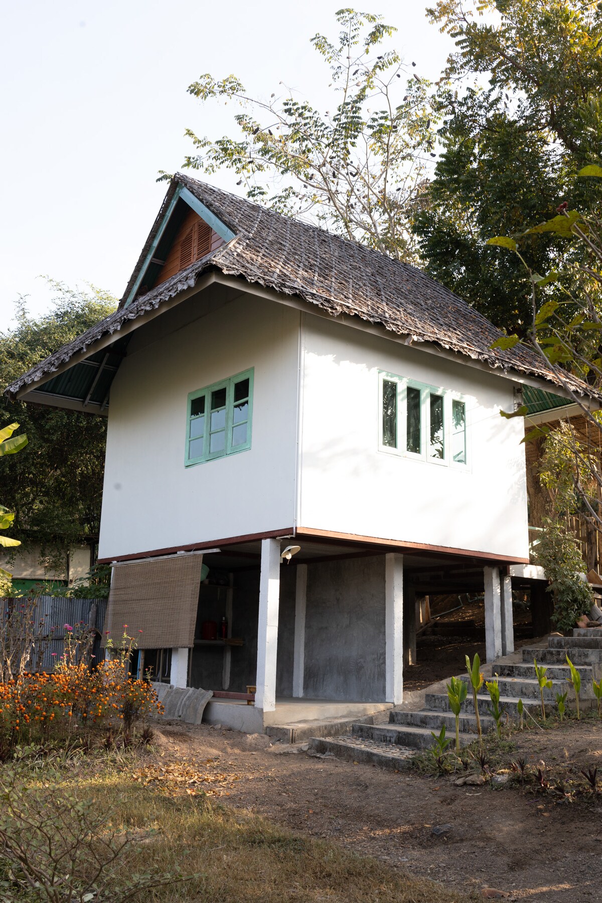 Detta är en fantastisk möjlighet att bo i en handgjord jordpåse roundhouse i Pai dalen. Det här stället är unikt att uppleva fördelen med att bo i en ekobyggnad. Allt är gjort av lokala material som jord, vitlökstrå och 80 år gammal teakträ. Det viktigaste är att den är unik, den byggdes av mig själv med kärlek och är full av inspiration och kreativitet, vi är så stolta över den och vill gärna dela denna känsla med våra gäster.