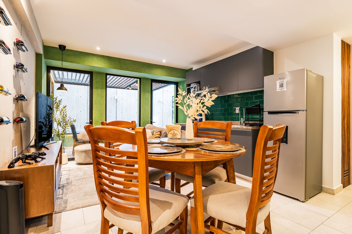 Lyxig lägenhet med PRIVAT TERRAS, fullt utrustad, med GRATIS PARKERING INOM ANLÄGGNINGEN, övervakning dygnet runt och HISS. Den ligger i Cuauhtémoc-området, 200 meter från Av. Paseo de la Reforma, stadens viktigaste gata. Några steg från lägenheten finns kaféer, restauranger, apotek, snabbköp, etc. 15 minuters promenad från Chapultepec-skogen och 10 minuters bilresa från Roma, Polanco och Centro Histórico.