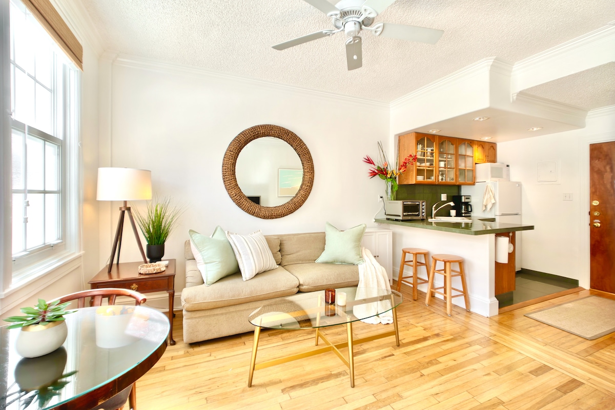 Promenad till stranden , lyxig studio i stan (aprx 500sqf). Helt renoverad gnistrande ren och ljus. Snabbt Wi-Fi 2Queen-sängar, lyxmadrasser, lyxiga sängkläder, kylskåp i full storlek, walk-in garderob, strandutrustning/kylare, stolar, handdukar. Omgiven av 7 restauranger, shopping, stor stormarknad, italiensk deli med en juicebar, hantverksmässigt franskt bageri, Bygga en 24/7 reception, uppvärmd pool, tvättstuga. Strikt inga husdjur och ingen rökning! Gratis gatuparkering 17:00-9:00. Parkeringsservice 15 USD/dag med begränsad kapacitet.