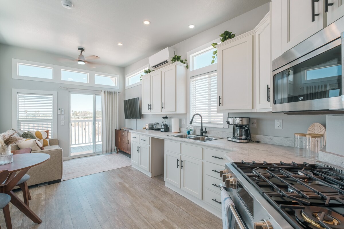 Skäm bort dig själv med denna helt nya 1-sovrum, 1-badrum öken gateway! Vårt hus ligger 15 meter från sjön med ett specialbyggt däck. Vår privata bakgård/uteplats gör det möjligt att koppla av medan du tittar på soluppgången eller solnedgången med sjöutsikt. Huset innehåller massor av naturlig belysning med helt nya vitvaror, två Samsung luftkonditioneringsapparater för split system kylning, och två Smart TV med super snabbt wifi (228 MBS). Resorten innehåller mineraliska varma källpooler, sportplaner, vandringsleder och mycket mer.