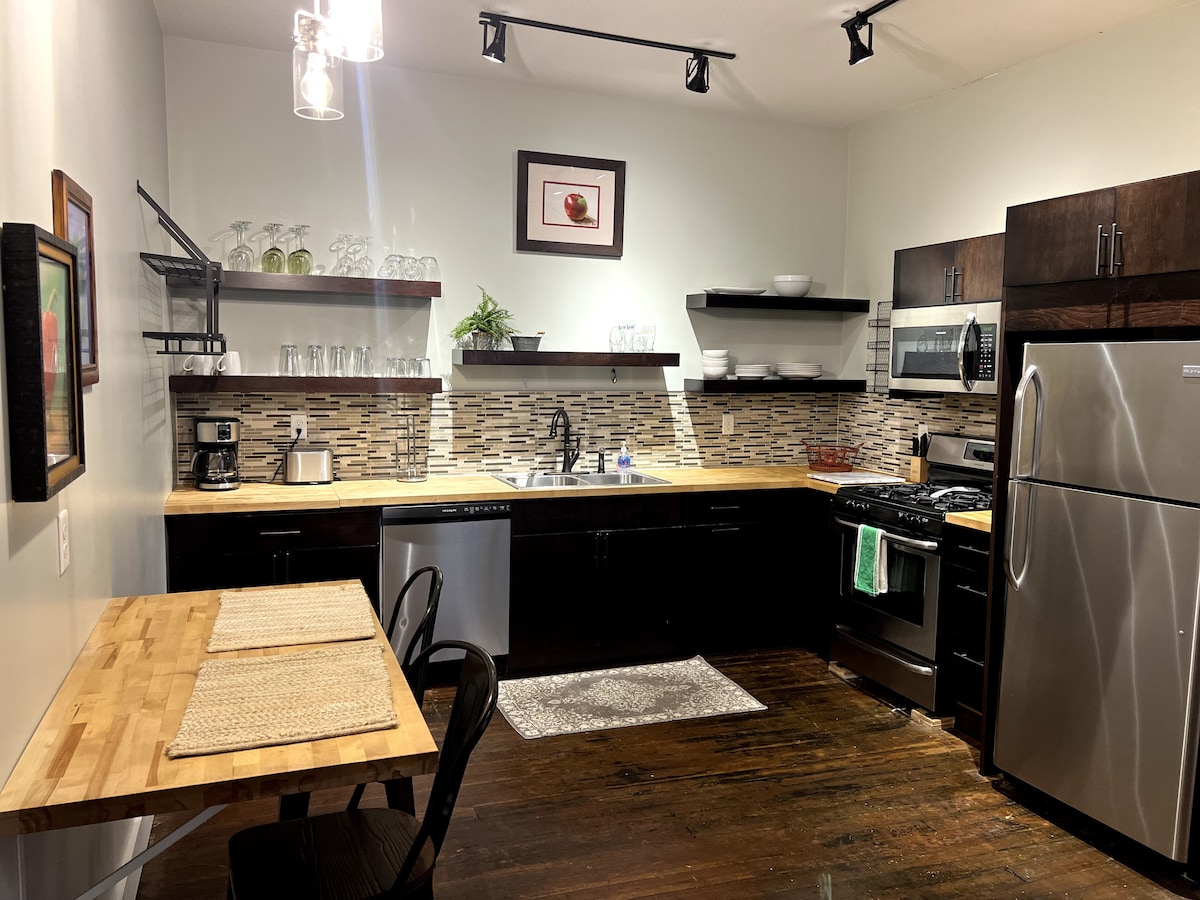 Välkommen till vår rymliga King Suite, en genomtänkt utformad, privat reträtt perfekt för par, ensamma resenärer eller längre vistelser. Denna vackert inredda svit kombinerar historisk charm med modern komfort — med en lyxig king size-säng, mysig öppen spis, fullt utrustat kök och inbjudande vardagsrum. Oavsett om du är på besök för en weekendresa eller bosätter dig för en längre vistelse är detta boende utformat för att kännas lugnt, bekvämt och enkelt att bo i.