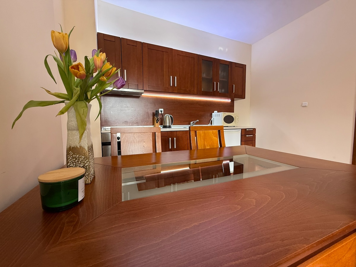 Hej och välkommen till vår semesterlägenhet "Milena". Lägenheten ligger i Lucky complex, ca. 7 min med bil från Studenets skidcenter. Lägenheten är efter en större renovering slutförd i början av 2023 och är idealisk för din semester i Pamporovo. Om du vill ha familjekomfort och en fullfjädrad vila i skogen i den friska bergsluften är detta ditt ställe - gratis parkering , fullt utrustat kök med tvättmaskin och torktumlare, kylskåp frys, smart-TV med Netflix och luftkonditionering