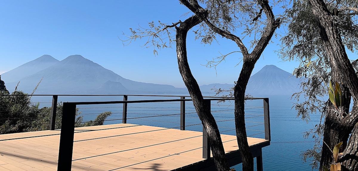 Mycket unikt och modernt lyxhus uppe i Guatemalas högland med känslan av att flyta upp i himlen (1700 m) - Har fri Starlink-anslutning med 24 timmars oavbruten el (litium/sol) - Alla fönster viks helt öppna för att hälsa på den andningsgivande utsikten över 5 vulkaner och "oändlighetssjön" av den ständigt föränderliga "målningen" - Filtrerat källvatten på kran - Bubbelpool i badrummet för en stängd eller öppen dörrupplevelse -12 m2 fribärande hängmatta däcknät för stjärnskådning och avkoppling