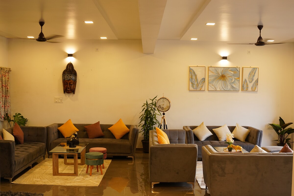 Lyxig 6BHK-villa med utsikt över bergen, frisk luft och en privat pool — perfekt för familjesemester eller värd för evenemang. Har rymliga lounger, eleganta sovrum med balkonger, ett fullt utrustat kök, smart-TV, Wi-Fi och daglig städning. Njut av utomhusmåltider, frodiga trädgårdar och lugna omgivningar. Perfekt för firanden eller fridfulla tillflyktsorter, bara några minuter från natursköna stigar och lokala sevärdheter. En perfekt blandning av natur, komfort och stil.
