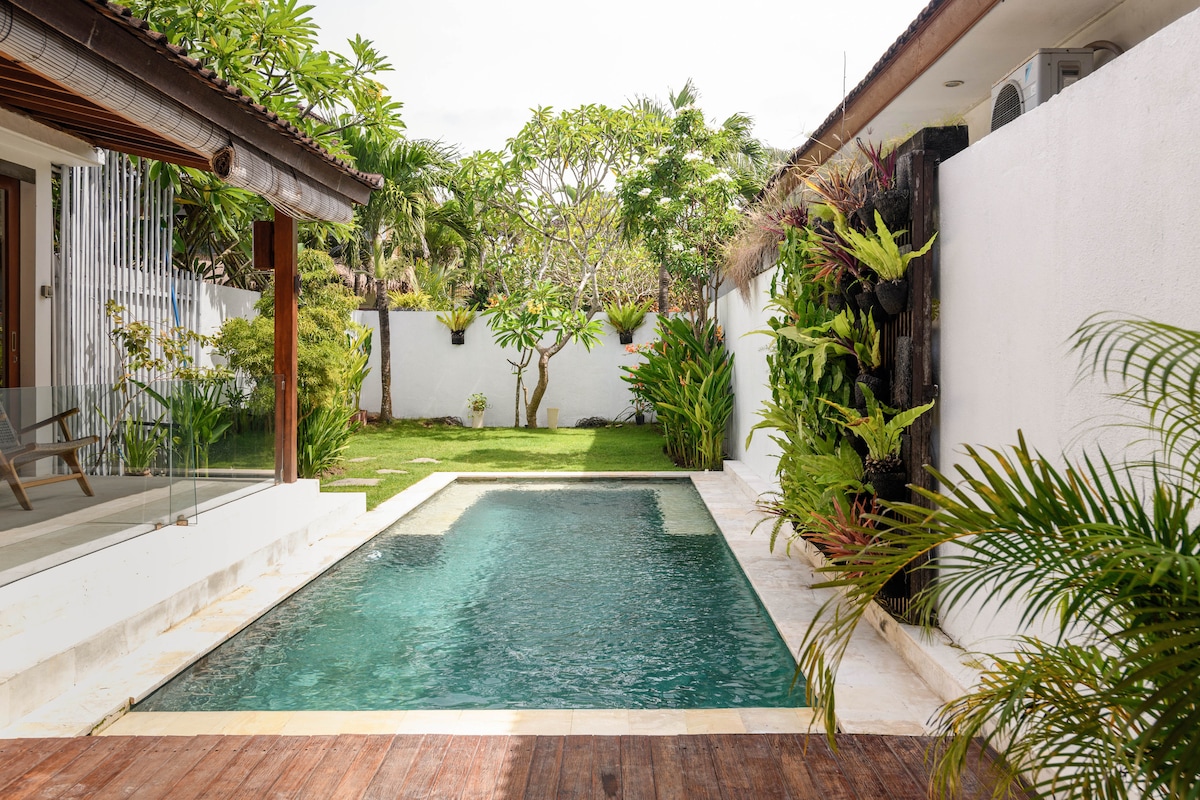 Njut av en elegant upplevelse på detta centralt belägna ställe. *Modern helt NY villa med 2 sovrum med loftdesign, privat pool och chillområde * Hjärtat av Canggu, 1,5 km till ECHO BEACH (LA BRISA), 1,6 km till BATU BOLONG BEACH *Wifi Superfast 150 Mb/s fiberoptik, perfekt för arbete och streaming *SmartTV(Netflix,Youtube) *Stort vardagsrum och modernt fullt utrustat kök med allt du behöver *2x bekvämt sovrum med tillhörande badrum och luftkonditionering *Parkering *Nära Crate café och Köpenhamn