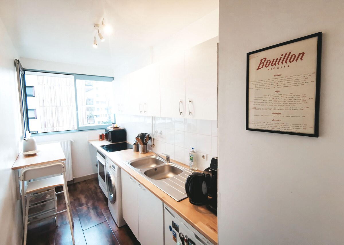 6:e våningen med hiss, 2 sovrum med dubbelsäng och en soffa i vardagsrummet (5 platser), en öppen spis och badrum. Ljus och nära Sacré Coeur och Moulin Rouge min lägenhet är lugn, söt och original, mitt i ett område fullt av barer och restauranger.