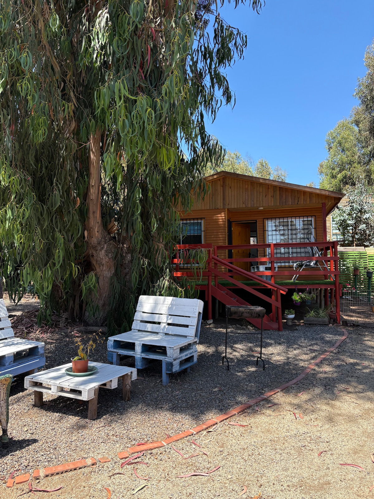 Cabaña rustica de madera y botellas, especial para desconectarse. Cómoda para 2 personas, cama de 2 plazas con sabanas incluidas , toallas de mano en el baño. Cocina encimera y mini refrigerador, parrilla y horno en un espacio en común que se puede utilizar con previo aviso. A 5 minutos de la entrada playa el Tebo, 15 de playa Cau-Cau y 15 de La caleta (caminando) en auto a unos 5 min. Estacionamiento compartido ya que la cabaña queda en el patio de nuestra casa.